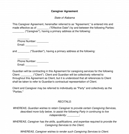 Download and Print Printable Caregiver Agreement Caregiver Contract Template
